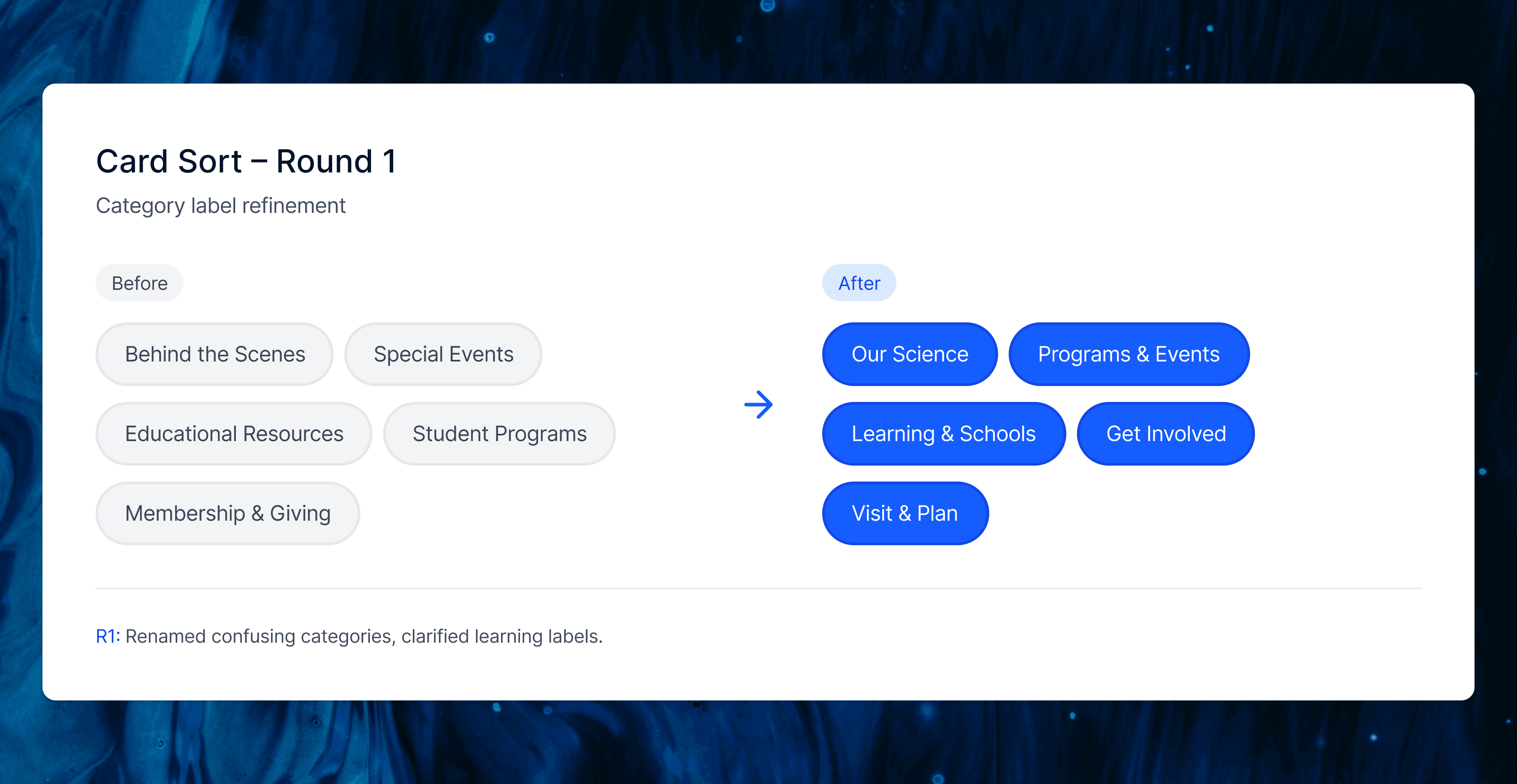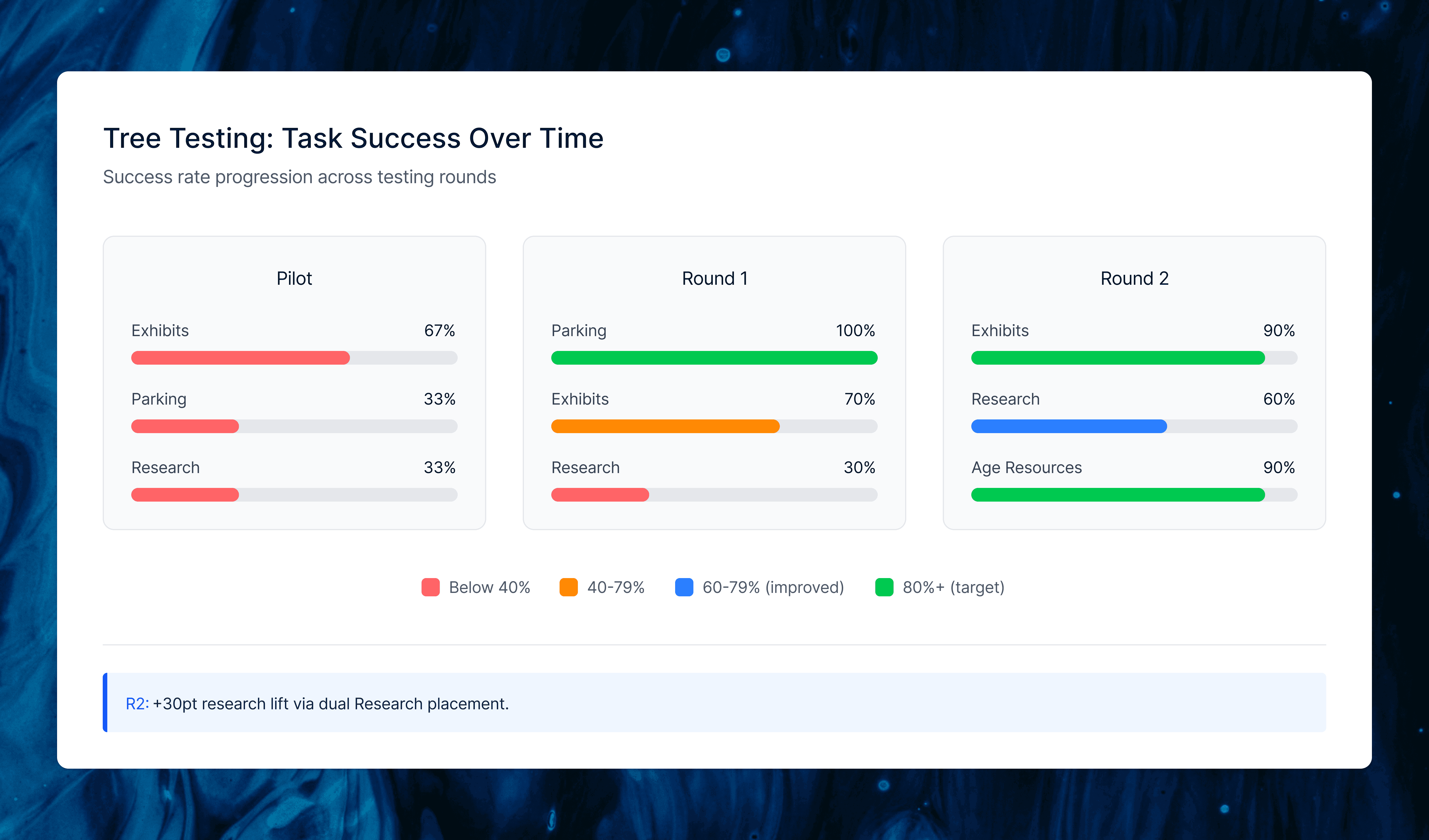 For Round 2, we moved Exhibitions higher under Visit, dually placed Research under both Learning and Research & Science, and refined prompts, boosting exhibits to 90%, research to 60% (+30 points), and age-specific resources to 90%. This confirmed our IA was now findable and set the foundation for the final sitemap.