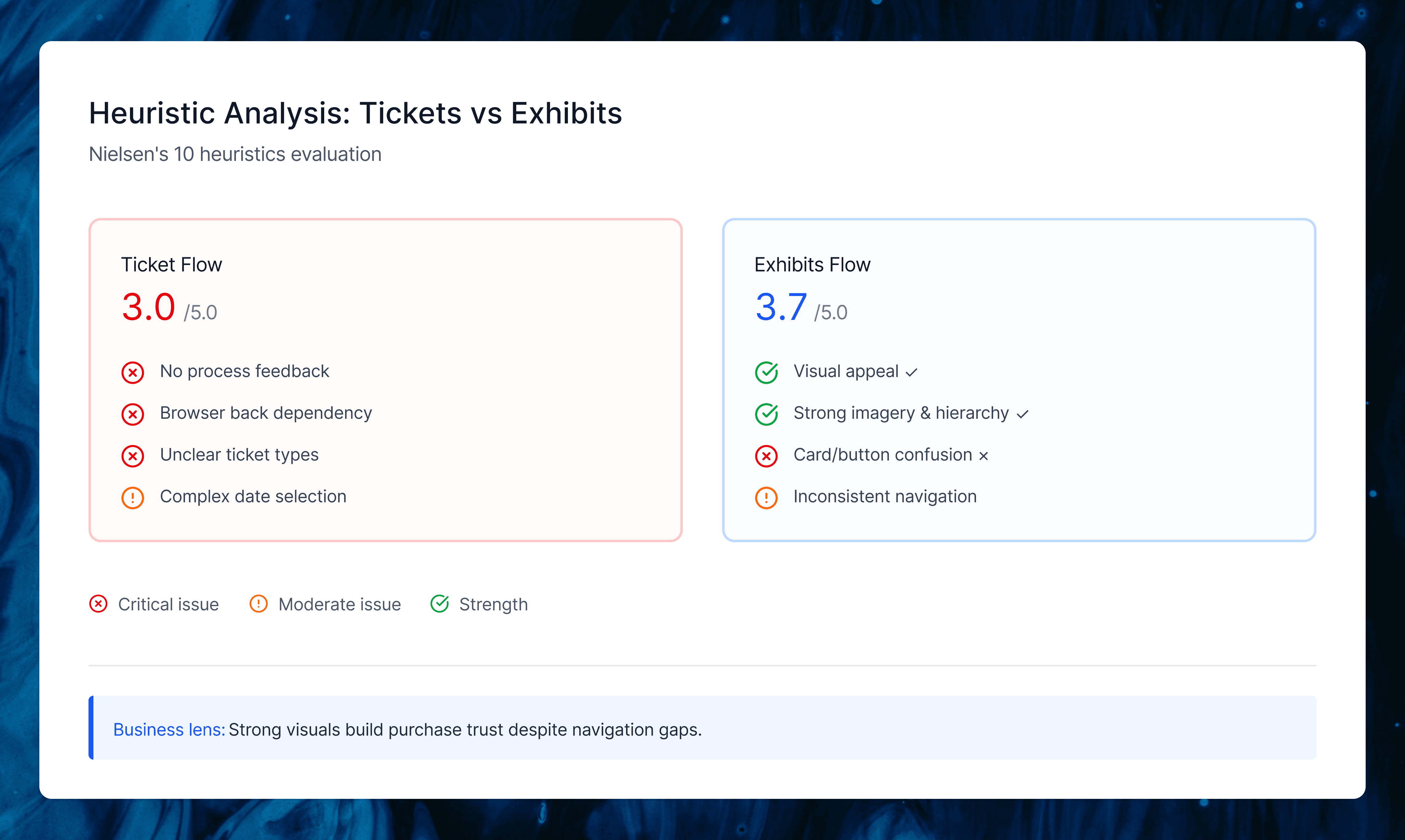 My teammates focused purely on user task completion, but I looked at it through a business lens—how well did the IA actually drive ticket sales, the museum’s main revenue stream? This made me rate visual consistency and design standards higher since they build purchase trust, even while calling out navigation gaps that hurt conversions. We had great debates about this, which helped us land on recommendations that served both users and the museum’s goals.