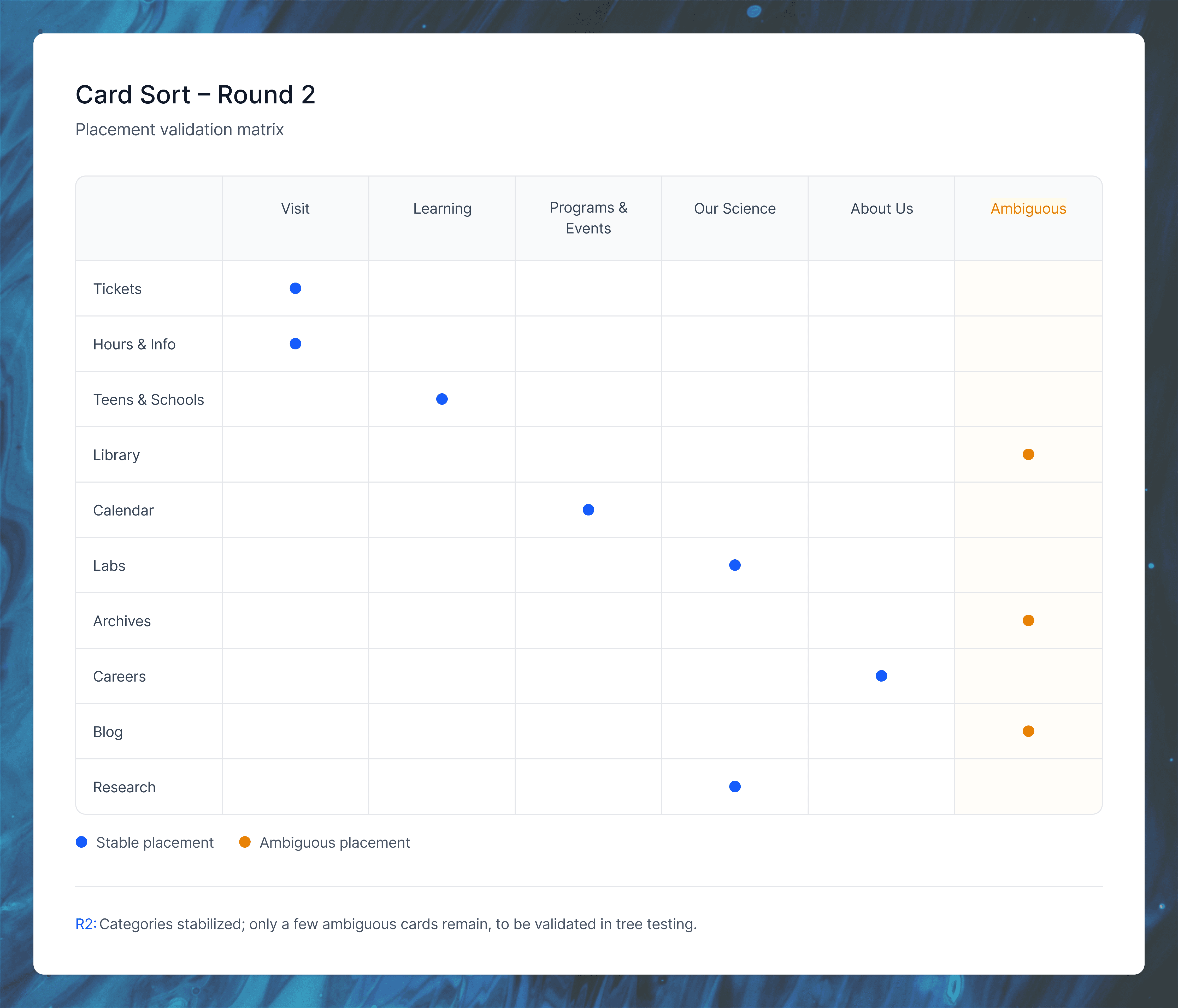 In Round 2, the updated labels performed more consistently. Most cards fell into their expected categories and confusion around “Our Science,” programs, and learning content dropped. Only a small cluster of items (like Press Room, Library, Archives, Accessibility, Groups, and Annual Memberships) remained ambiguous, which we resolved using IA judgment and planned to validate in tree testing. This round confirmed that the core category structure was now stable enough to move forward.