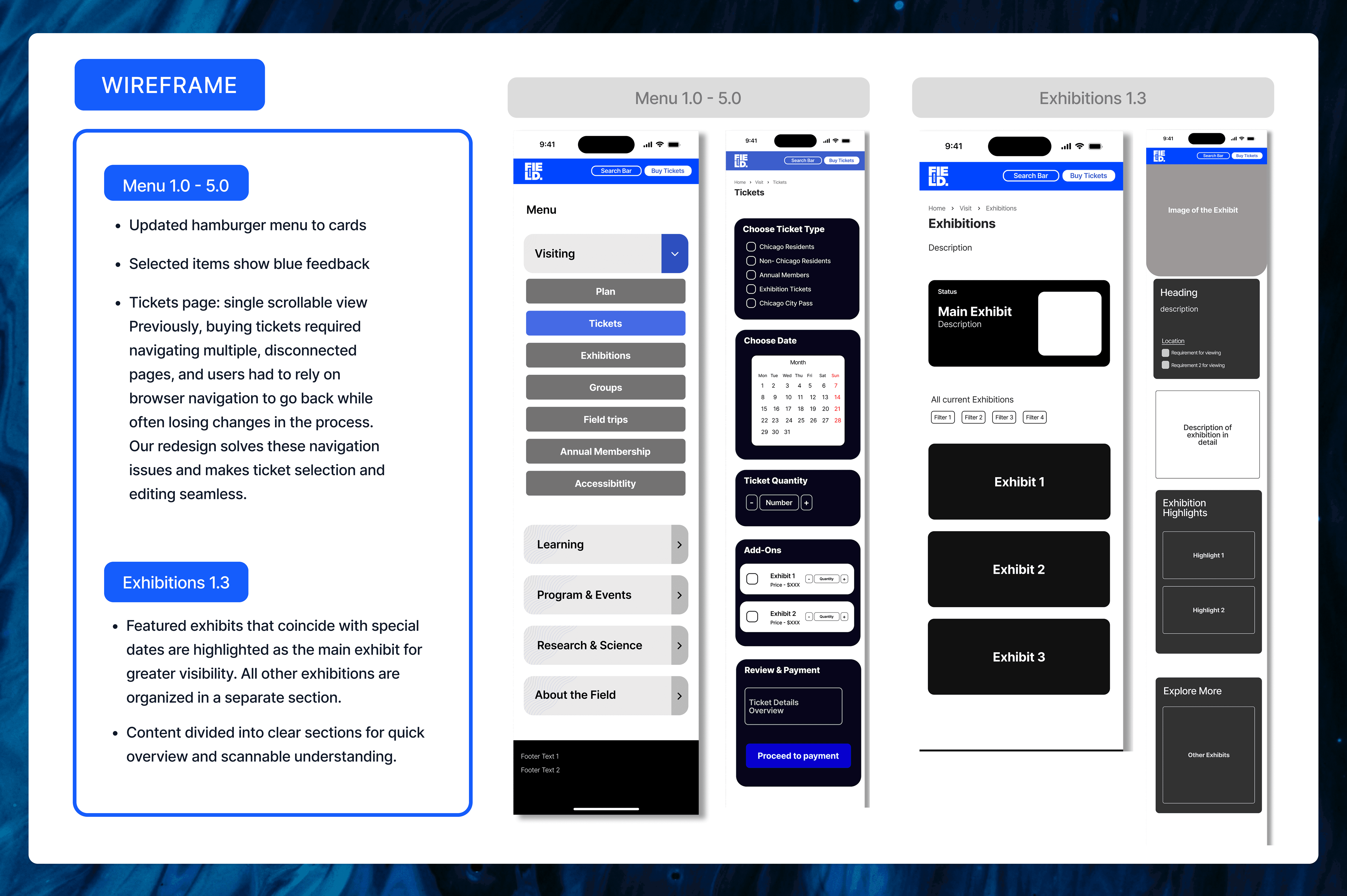I took full ownership of the wireframes, directly translating heuristic analysis findings into two redesigned flows: ticket purchasing and exhibitions browsing. Where the evaluation exposed navigation gaps and mental model mismatches, I created concrete UI solutions that embodied our tested IA.