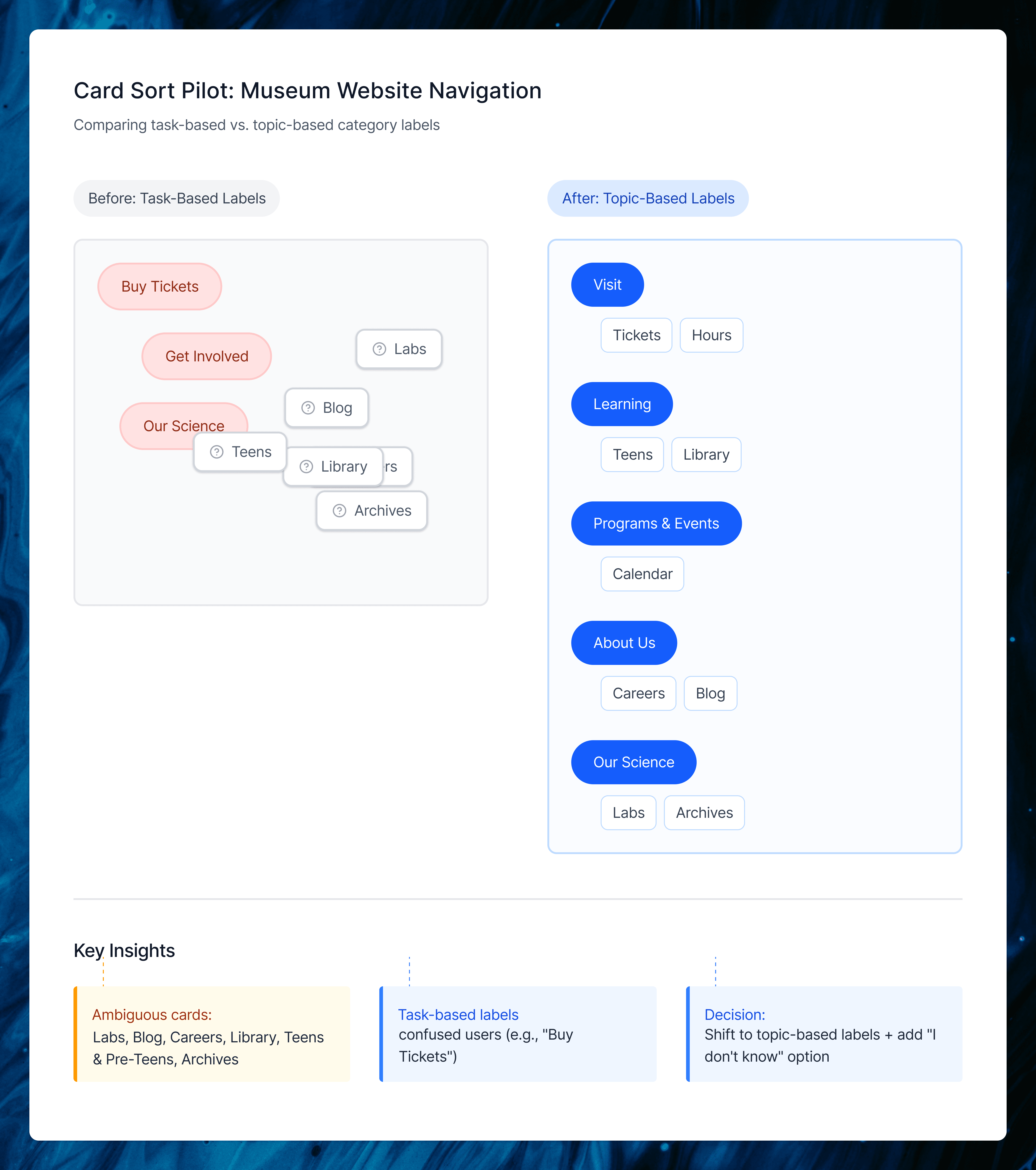 Card Sorting helped us understand how people naturally expected the Field Museum’s content to be grouped and named. We ran a pilot and two closed card sort rounds, using each step to clean up confusing labels and bring our IA closer to real visitor mental models.