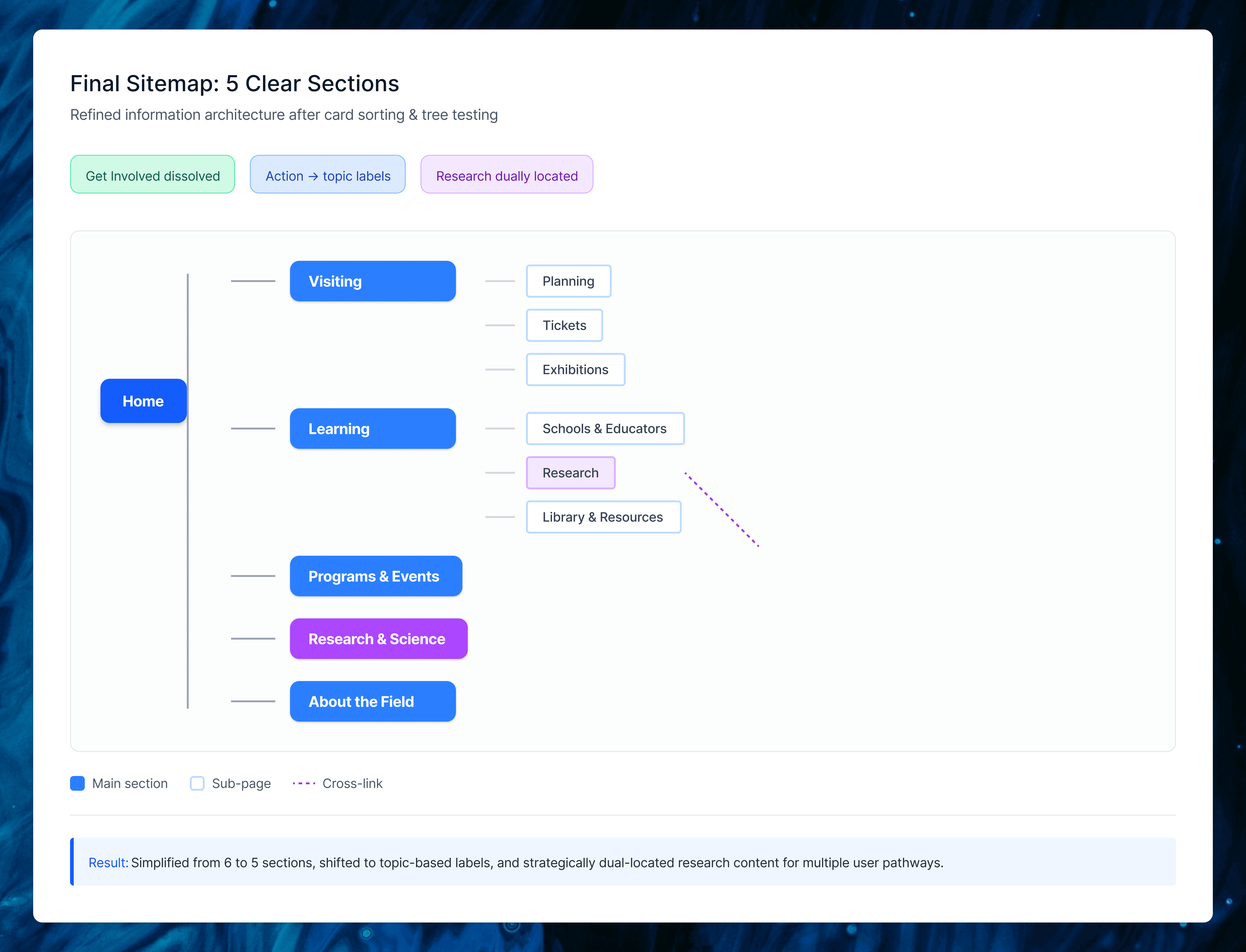 The biggest decision was dually locating “Research” under both Learning and Research & Science. Tree testing showed users expected academic content in both places, so we made it findable wherever they looked. This structure directly reflected card sort groupings and tree test paths, creating navigation that matched visitor mental models.