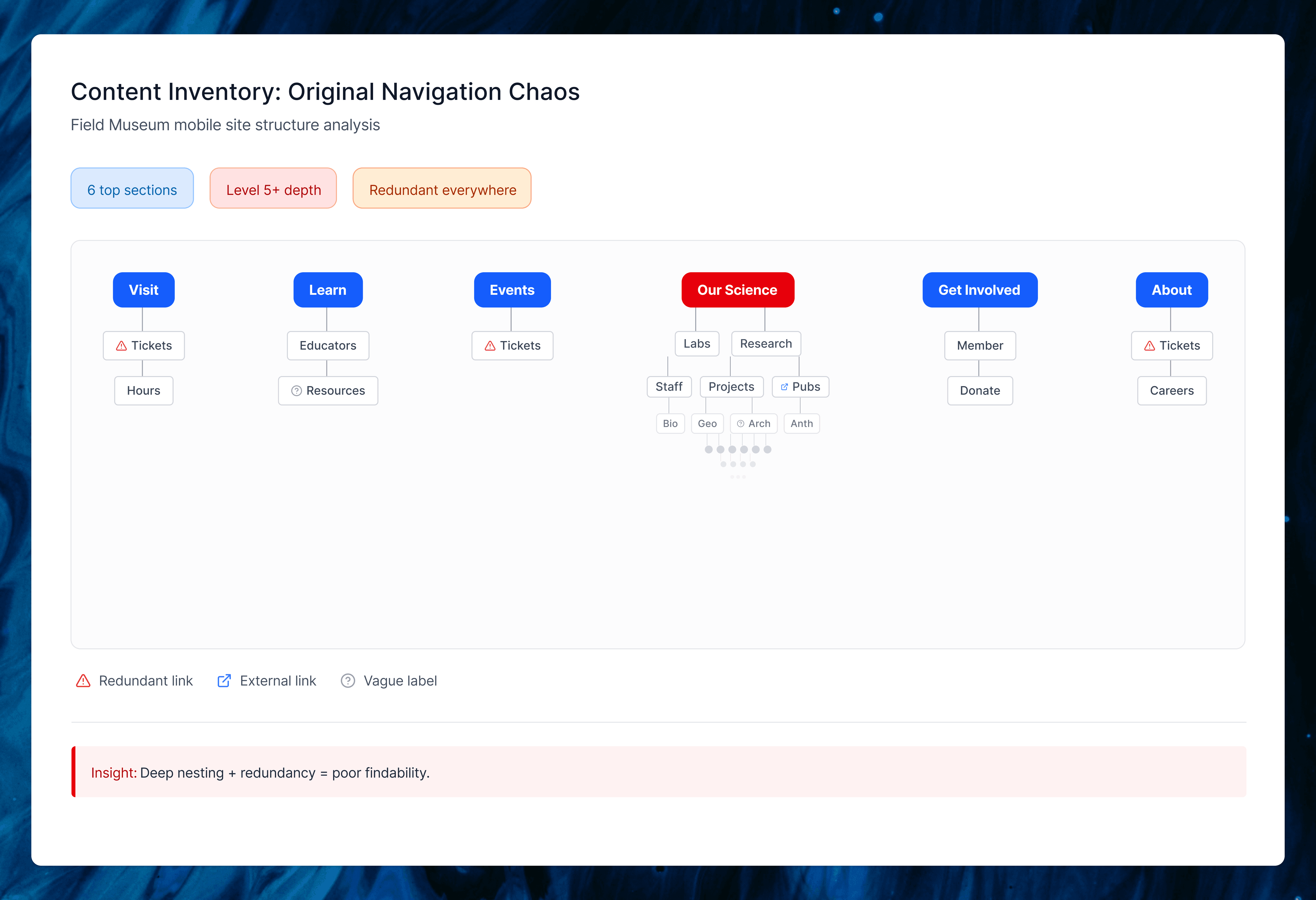 What is the Field Museum? The Field Museum located in Chicago, Illinois. The museum itself attracts over 1 million visitors annually. The website for the Field Museum allows users to purchase tickets, discover about the exhibits inside, and learn about the museum’s conservation efforts. The Problem: While the main structure worked well initially, deeper exploration revealed disorganized and repetitive content. We aimed to create a clearer, more intuitive experience that helped users find what they needed effortlessly. Our Goals: Our goal was to enhance the Field Museum’s mobile website by improving its information architecture and simplifying how visitors navigate it.